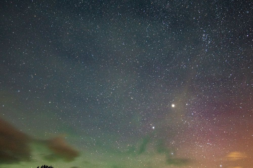 Schöne Nordlichter in einer klaren Nacht mit einigen Wolken und Milchstraße, Sternenhimmel in Schottland bei Findhorn Ecodorp