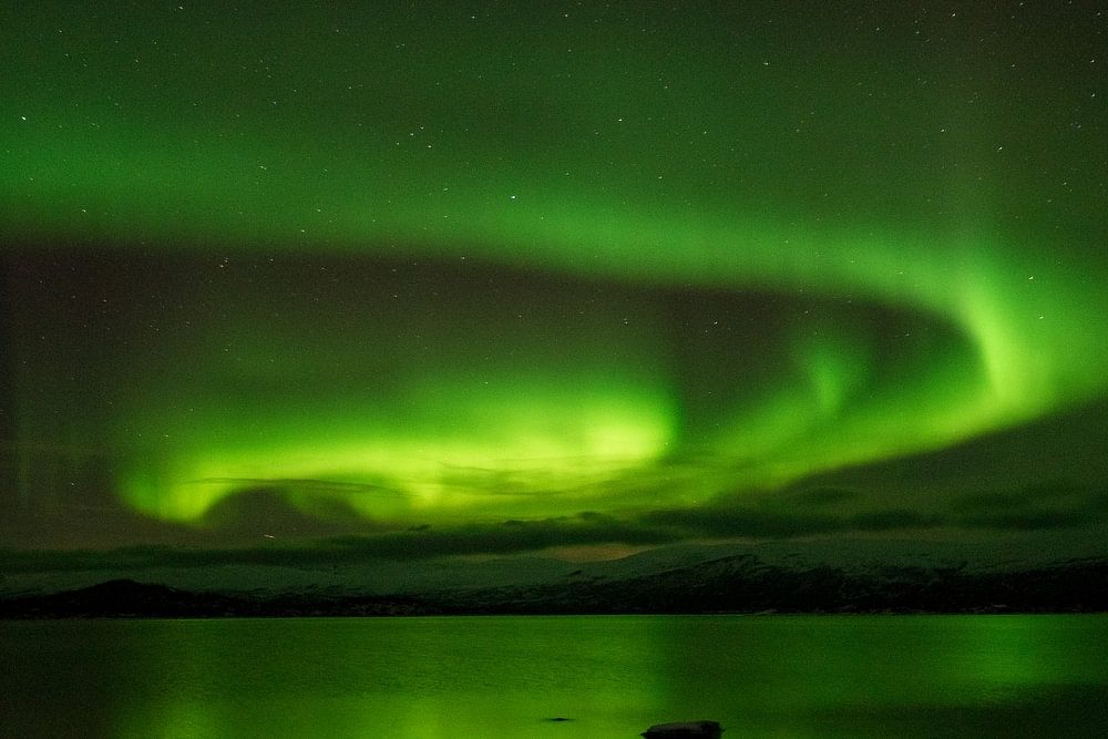 Früh in der Saison, wenn der Torneträsk-See noch nicht zugefroren ist, gibt es bereits Nordlichter. Dann spiegeln sich die Nordlichter auf dem Wasser, wenn es windstill ist.