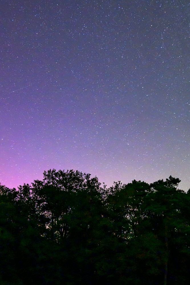 Nordlicht, Polarlicht und Milchstraße am Nachthimmel über dem Wald im Nationalpark Dwingelerveld in Drenthe, Niederlande, in der Sommernacht des 12. August 2022. Es ist selten, dass Nordlichter in den Niederlanden gesichtet werden können.