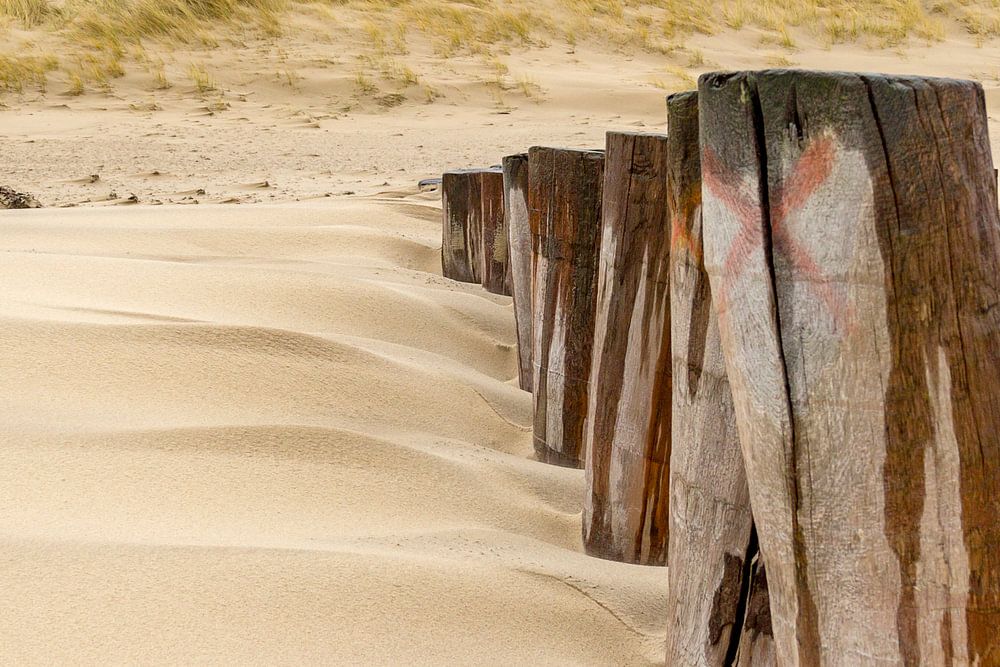 Sandstrand-Detail mit hölzernen Buhnen an der Nordseeküste nahe Domburg in Zeeland, Niederlande