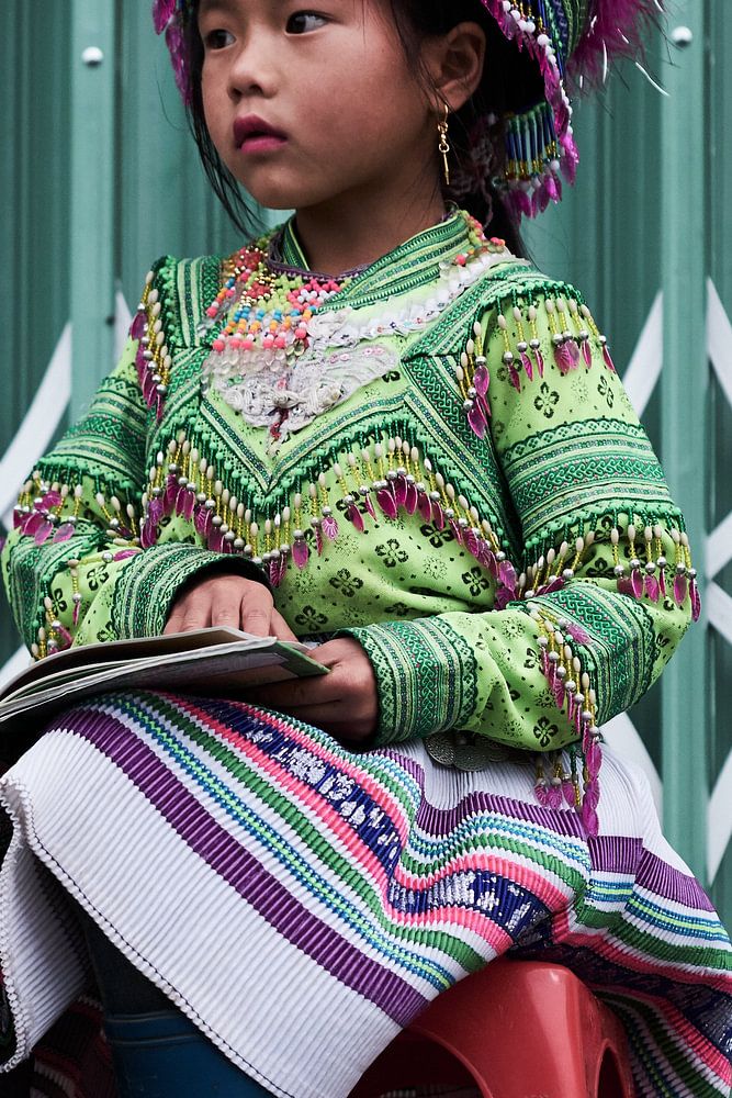 Nordvietnamesisches Mädchen in Sapa. Kleines Mädchen in Kostüm liest Buch