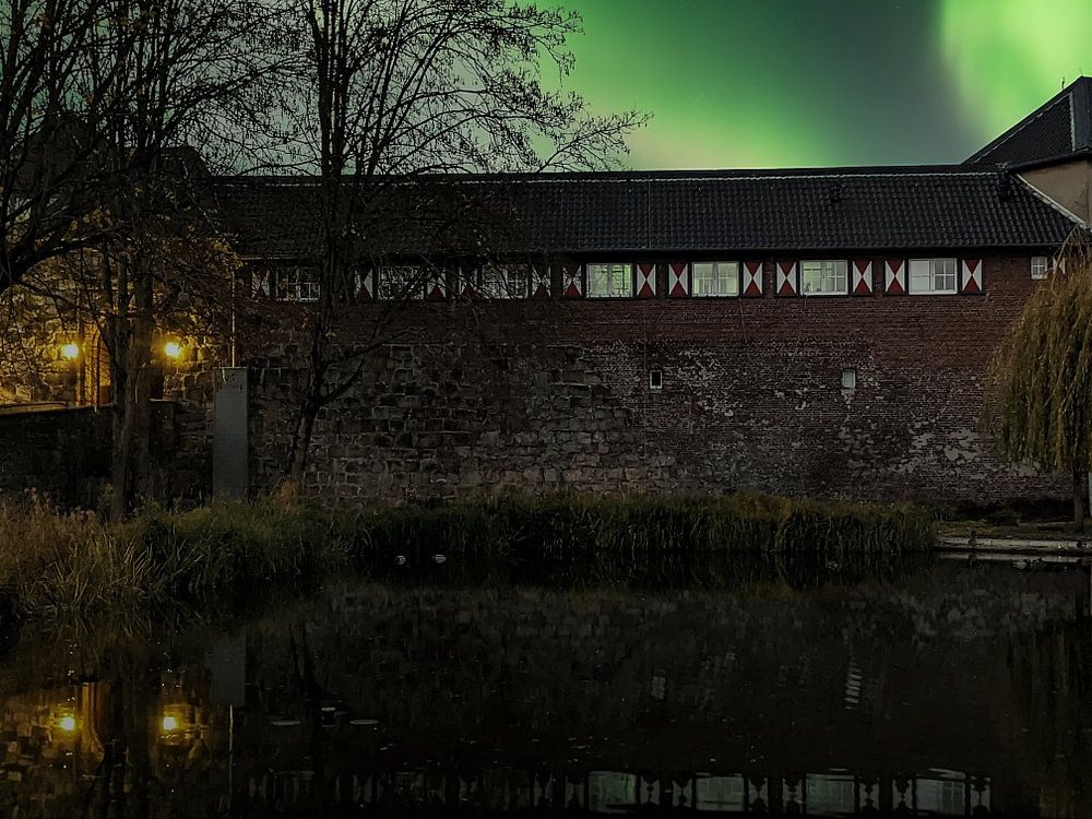 Nordlichter über der alten Burg Dinslaken in Nordrhein-Westfalen