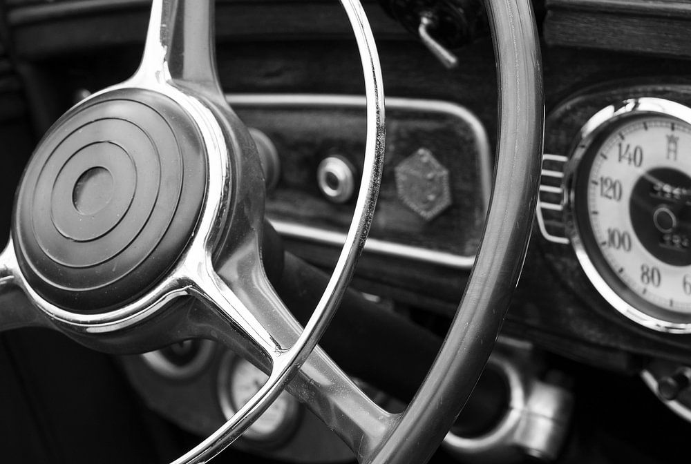Nostalgisches Cockpit eines alten Oldtimers, Schwarz-Weiß-Fotografie