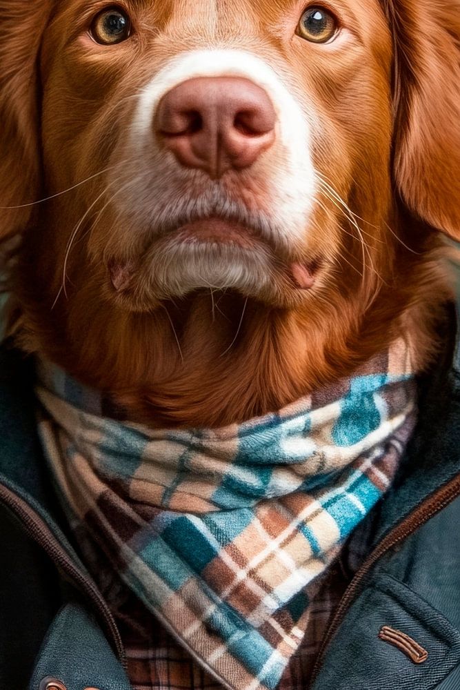 Majestätisch in seinem blauen Outfit mit einem charmanten Schaltuch strahlt dieser Nova Scotia Duck Tolling Retriever Lebensfreude und Eleganz aus. Seine aufmerksamen, leuchtend braunen Augen und der sanfte Gesichtsausdruck spiegeln Neugier und Intelligenz wider, während das üppige, kupferfarbene Fell einen Hauch von Wärme und Freundschaft vermittelt. Ein wahrer Charmeur!
