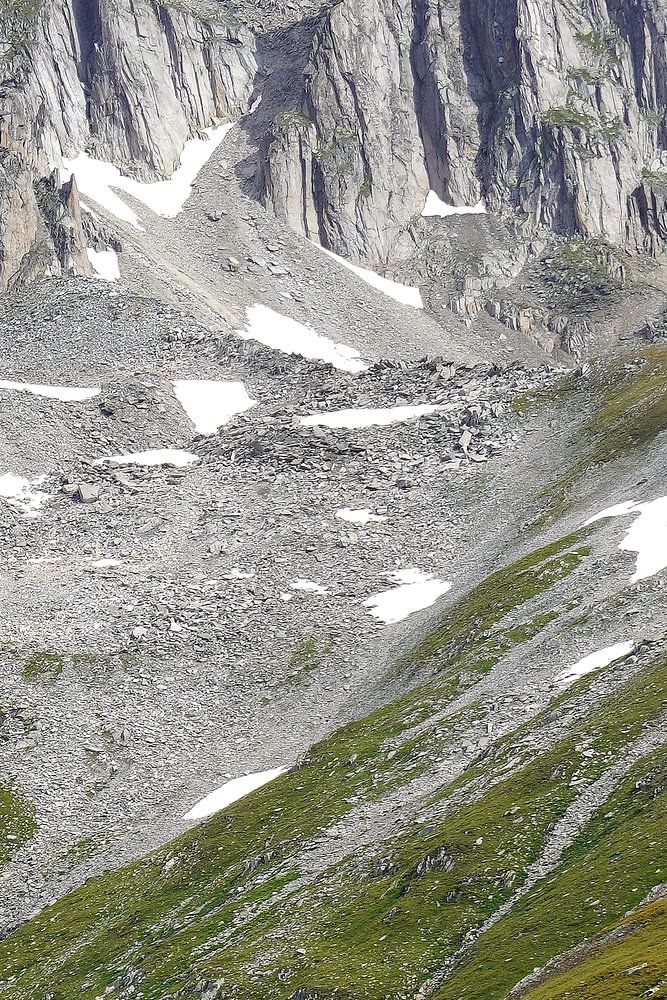Blick auf die Berge vom Nufenenpass aus, auf dem Weg von der Schweiz nach Italien. Die kontrastierenden Farben der harten Steinberge und des grünen Grases erzeugen Abstraktion. Der gewählte Ausschnitt von Formen und Linien verstärkt dies noch.