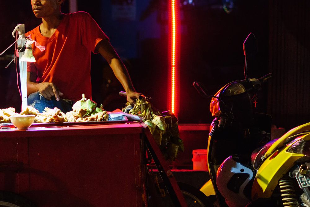 Ein Straßenverkäufer von gebratenem Hähnchen hat seinen mobilen Stall vor einem Café in einer der belebten Straßen in der Innenstadt von Cebu auf den Philippinen aufgebaut. er ist bereit für diejenigen, die einen Happen essen wollen, bevor der abendliche Berufsverkehr beginnt.