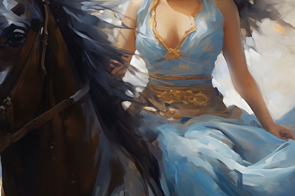 Ölgemälde eines schönen Mädchens in einem blauen Kleid, das auf einem Pferd reitet
