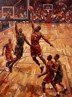 Bestelle diese Malerei Ölgemälde mit dynamischer Basketballszene von Jan Keteleer als Reproduktion auf Leinwand, Alu-Dibond, als Poster, Fototapete oder Acrylglasbild.