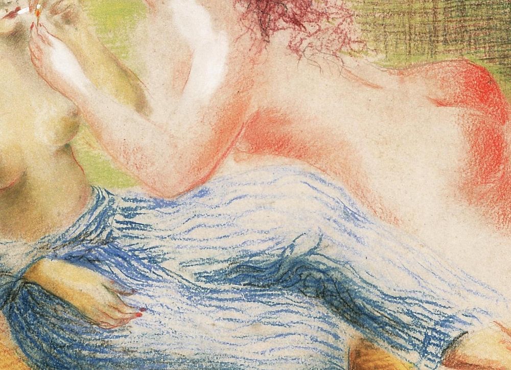Ein lesbisches Paar, bestehend aus zwei Frauen, liegt romantisch beieinander, raucht und teilt sich eine Zigarette. Die eine Frau trägt ihre Kleidung offen, so dass ihr Oberkörper und ihre Brüste auf dem Porträt zu sehen sind. Das andere Mädchen liegt nackt neben der ersten jungen Dame, so dass ihr Gesäß auf dem Gemälde hervorsticht.