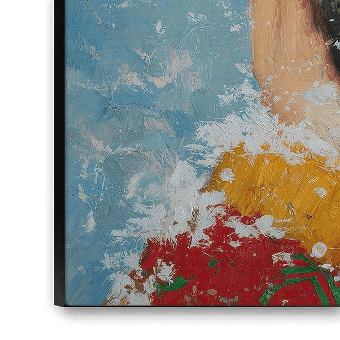 Stijl en uitvoering zitten tussen surrealistisch en impressionistisch in: de voorstelling is herkenbaar (vrouw, bril, oorwarmers), maar de overmaat en het kleurgebruik geven het een speelse, bijna droomachtige sfeer die in mijn kerst schilderij serie past. In de tekstuur en kleurkeuze heb ik gezocht naar contrast: het koele ijsblauw van de achtergrond versus de warme perzikroze lippen en mosterdgele mouw. Daarom werkt dit als een modern kerst schilderij voor een frisse, hedendaagse inrichting — het oogt feestelijk zonder sentimenteel te worden, vrolijk zonder kinderachtig te zijn.