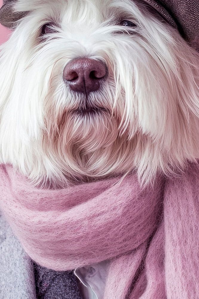 Mit einem charmanten Hütchen und einem eleganten Schal verkörpert dieser Old English Sheepdog puren Stil. Sein wuscheliges, schneeweißes Fell strahlt Sanftmut und Freude aus. Der leicht erhobene Kopf vermittelt eine noble Haltung, als ob er gerade auf eine unvergessliche Teegesellschaft vorbereitet wäre. Ein wahrhaftes Meisterwerk der Hundemode!