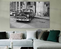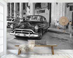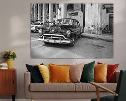 Schwarz-Weiß-Reisefotografie eines wunderbaren Oldtimers, der in einer Straße in Old Havana, der Altstadt und dem Stadtzentrum von Havanna, Kuba, geparkt ist.