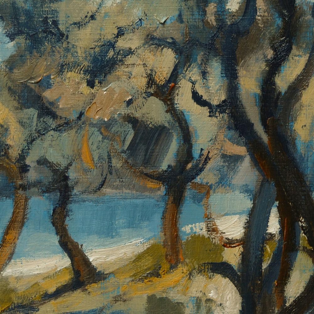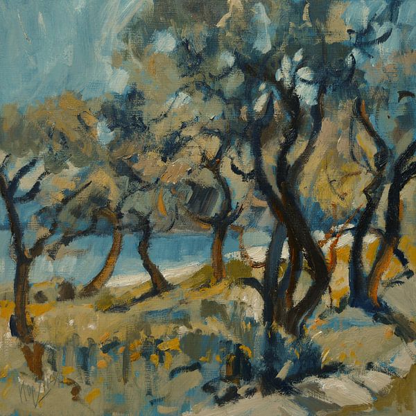 Bestelle diese Malerei Olivenhain am Strand von Nop Briex als Reproduktion auf Leinwand, Alu-Dibond, als Poster, Fototapete oder Acrylglasbild.