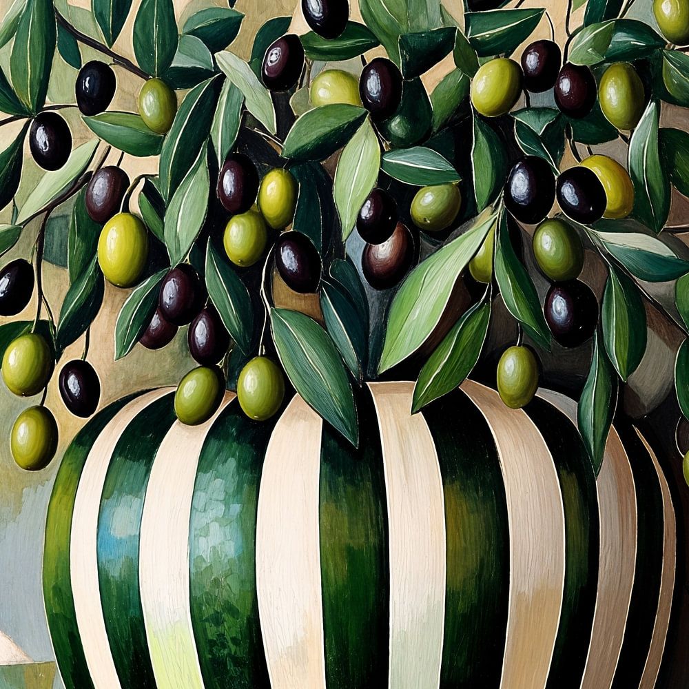 Eine Vase mit Olivenzweigen in verschiedenen Grüntönen.