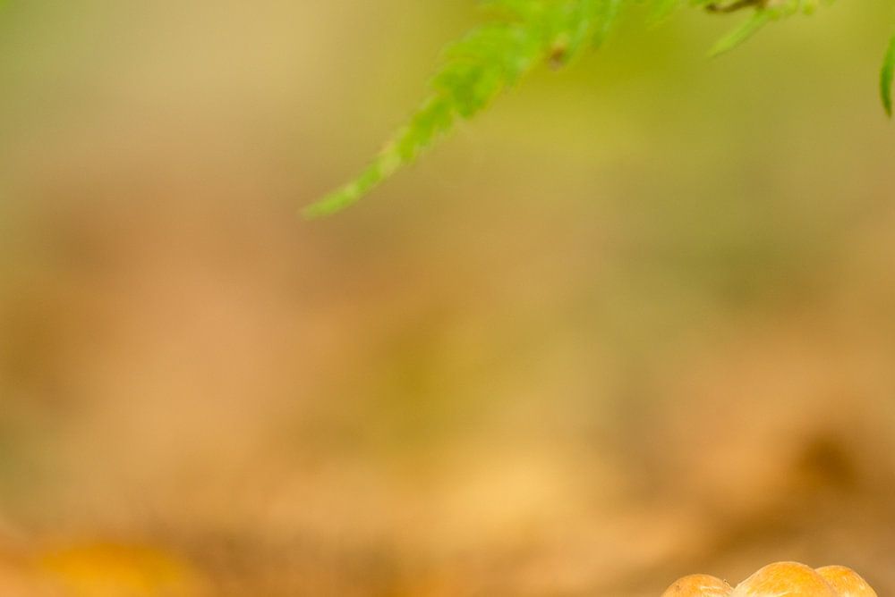 Een rustig plekje in het Zoniënwoud. De paddenstoelen werden door boombladeren op de grond gefotografeerd, wat zorgt voor een zachte sfeer. De varens lijken wel een beschermend dak te vormen.