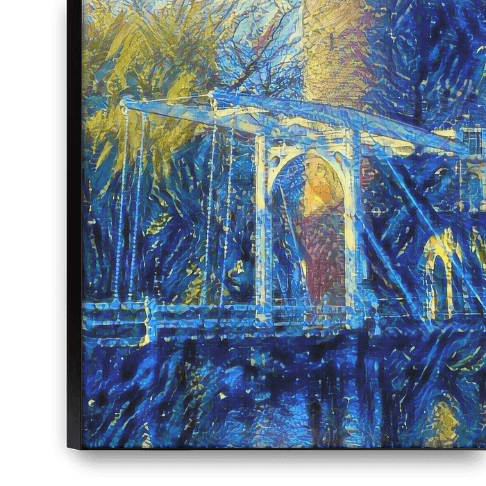 Wir machen Kunst mit künstlicher Intelligenz. Unser Algorithmus beherrscht verschiedene Malstile. Zum Beispiel expressionistisch oder vom Kubismus inspiriert! Wir malen bekannte Orte der großen niederländischen Städte mit unserem Algorithmus. Die Groningen Hoge der Aa im Stil von Van Gogh. Die Rotterdamer Erasmusbrücke im Stil von Picasso. Oder die Grachtenhäuser, als ob Piet Mondrian bei der Arbeit gewesen wäre!