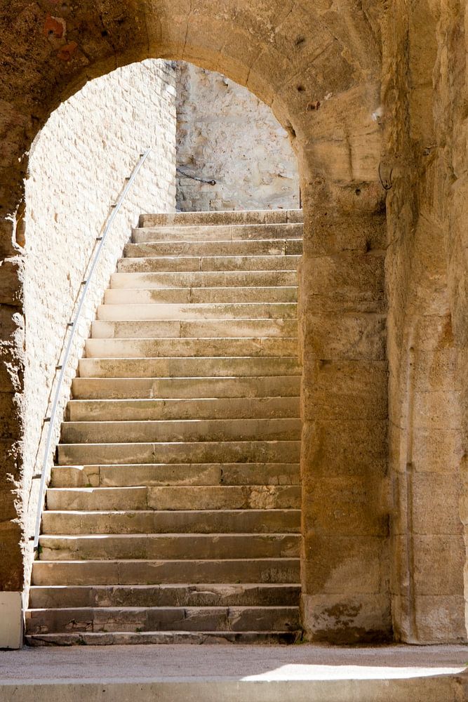 Das Foto zeigt die Treppe, die im Inneren des Theaters nach oben führt. Gleichzeitig zeigt das Foto einen kleinen Ausschnitt der Außenwelt. Damit kann dieses Foto als Symbol für eine Vielzahl von Themen verwendet werden.