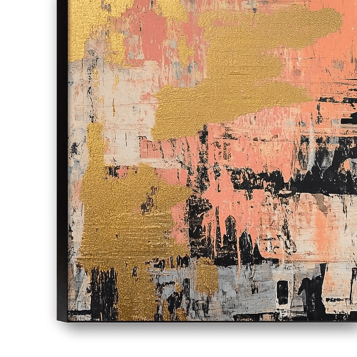 Orange-gelber Hintergrund - Dieses abstrakte Gemälde zeigt die Silhouette eines kleinen Kindes oder einer Person vor einem Hintergrund aus chaotischen, bunten Pinselstrichen in Orange-, Gelb- und Schwarztönen, die ein Gefühl von Bewegung und urbaner digitaler Kunst suggerieren.