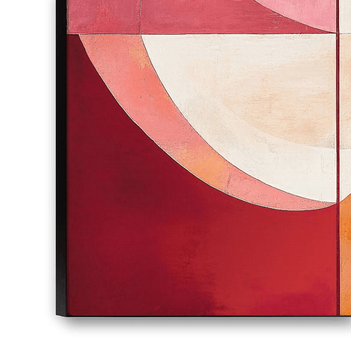 Ein elegantes, geometrisches Kunstwerk in warmen Rosa-, Rot- und Terrakottatönen, in dem Halbkreise und Linien harmonisch zusammenwirken. Die Komposition strahlt Ruhe und Ausgewogenheit aus, dank sanfter Farbübergänge und der symmetrischen Anordnung der Formen. Das moderne, minimalistische Design wirkt beruhigend und verleiht dem Ganzen gleichzeitig Dynamik durch die spielerische Platzierung geometrischer Elemente.