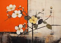 Orangefarbene Blumen – Auf diesem Blumenbild sehen Sie einen Zweig mit auffälligen weißen und gelben Blumen vor einem leuchtend orangefarbenen Hintergrund, der dem Ganzen einen modernen Touch verleiht.