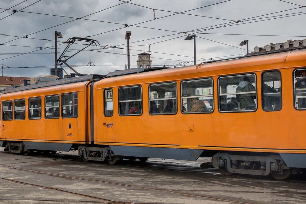 Orangefarbene Straßenbahn im Zentrum von Turin, Italien