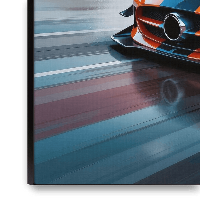 Orangefarbener Sportwagen, der auf einer nassen Rennstrecke mit Bewegungsunschärfe fährt
