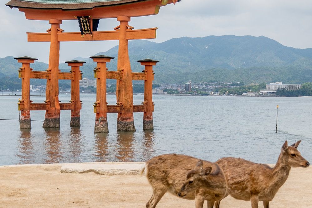 Orangefarbenes Torii, "schwimmendes" Tempeltor auf der Insel Miyajima. Das Torii befindet sich in seiner Umgebung mit dem heiligen Hirsch im Vordergrund, der anscheinend die Aufgabe übernommen hat, es zu beschützen.
