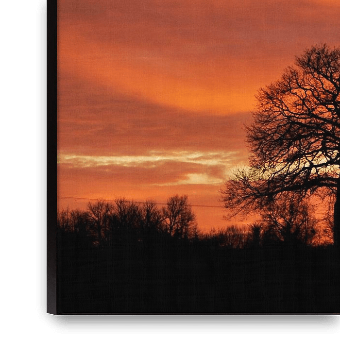 Ein orangefarbener Himmel bei Sonnenuntergang. Unten auf dem Foto befinden sich die Silhouetten der französischen Landschaft mit einer kahlen Eiche, die am höchsten herausragt.