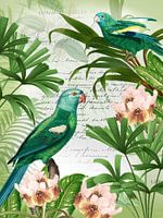Zwei Papageien haben es sich gemütlich gemacht zwischen Palmen und blühenden Orchideen.