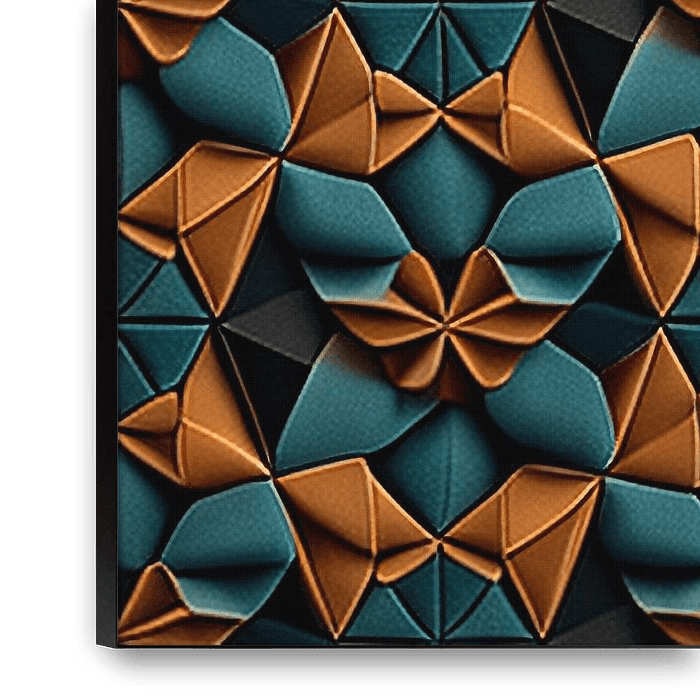 Dieses Bild zeigt ein faszinierendes geometrisches Muster, das sich aus gefalteten, origami-ähnlichen Formen in tiefen Teal- und warmen Kupfertönen zusammensetzt. Das symmetrische Design erzeugt ein Gefühl von Tiefe und Textur, das an komplizierte, ineinandergreifende Fliesen oder Stofffalten erinnert. Die abwechselnden Spitzen und…