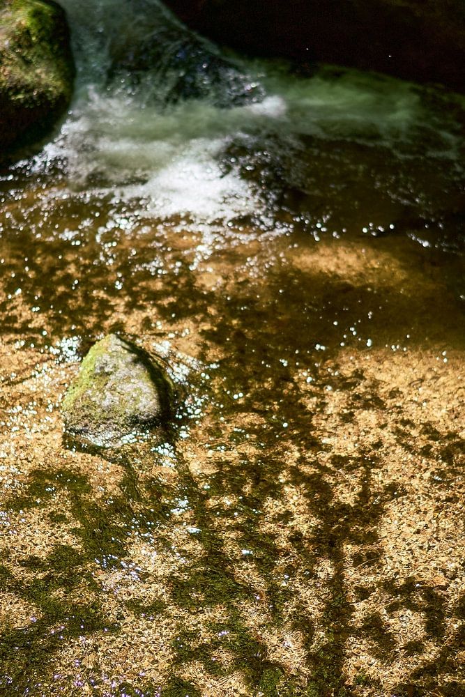 Das Sonnenlicht strahlt in den Pumpen eines Wasserfalls und zeichnet Schattenmuster von den herabhängenden Ästen auf das Wasser
