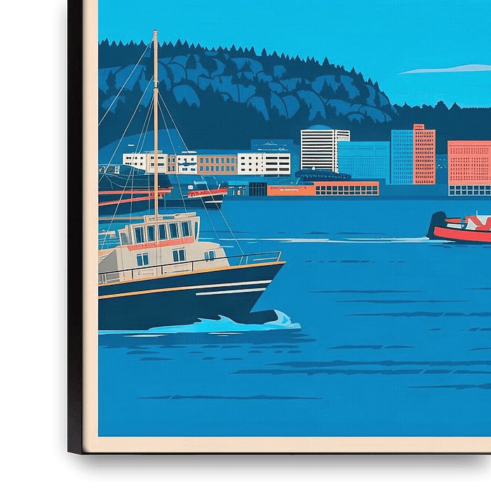 Blaugrüne Wellen schaukeln sanft, während bunte Container den Hafen von Oslo beleben. Elegante Schiffe gleiten durch die ruhige Förde, umgeben von malerischen Hügeln. Über allem schwebt der Schriftzug „OSLO, NORWAY“ und verspricht Abenteuer in einer Stadt, wo Natur und urbaner Charme harmonisch verschmelzen. Ein eingängiger Blick auf…