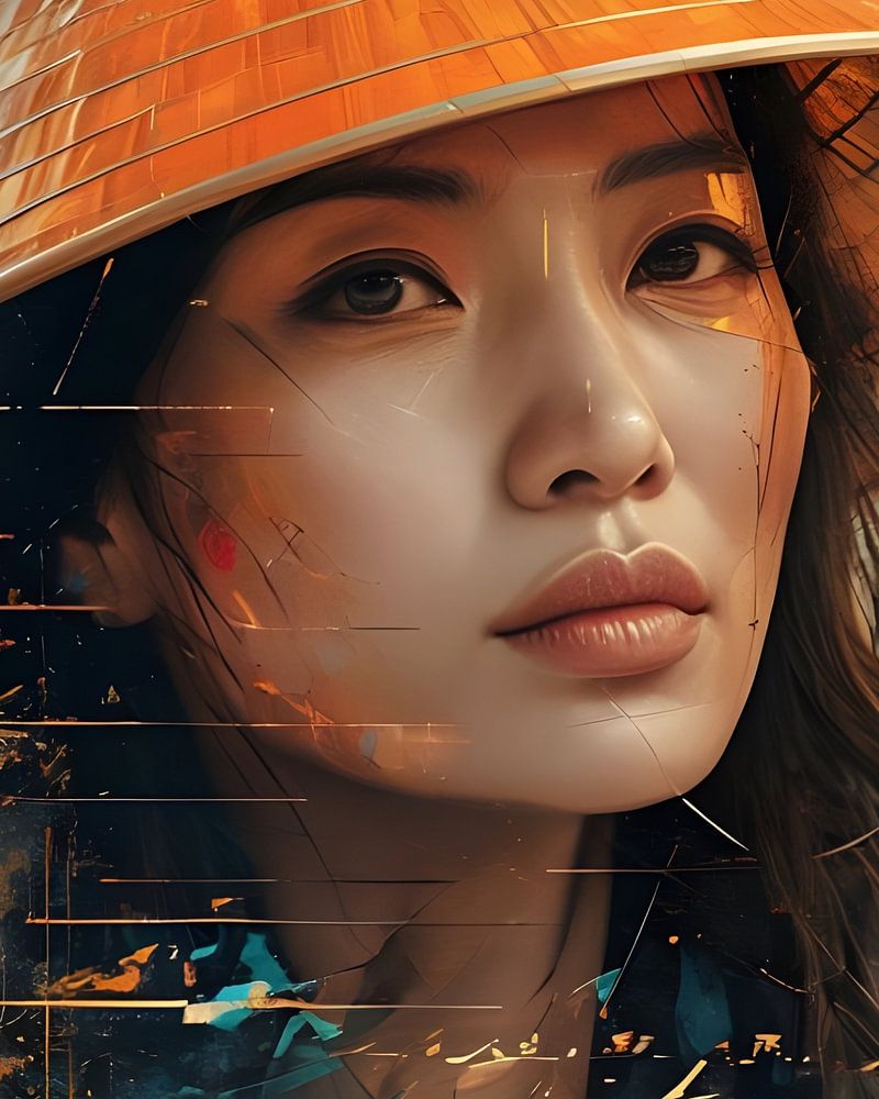 Ostasiatische Frau mit orangefarbenem konischem Hut und warmer Atmosphäre. Der Hintergrund besteht aus einer Mischung aus blau-grünen, goldenen und beigen Farben, die in einem dynamischen, fast strukturierten und gebrochenen Stil aufgetragen sind und ein Spiel von Licht und Schatten suggerieren. Der Stil ist realistisch und doch malerisch, mit sichtbaren Pinselstrichen und leichter Textur, die eine künstlerische Atmosphäre schaffen. Es wird eine Vielzahl von Farben und Schattierungen verwendet, die die Gesichtszüge der Frau hervorheben und der Komposition Tiefe verleihen. Die Beleuchtung ist weich und diffus, ohne harte Schatten. Der Gesamteffekt ist eine Mischung aus Realismus und künstlerischem Ausdruck.
