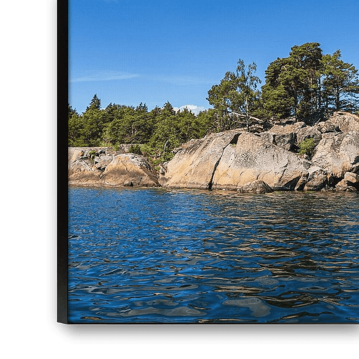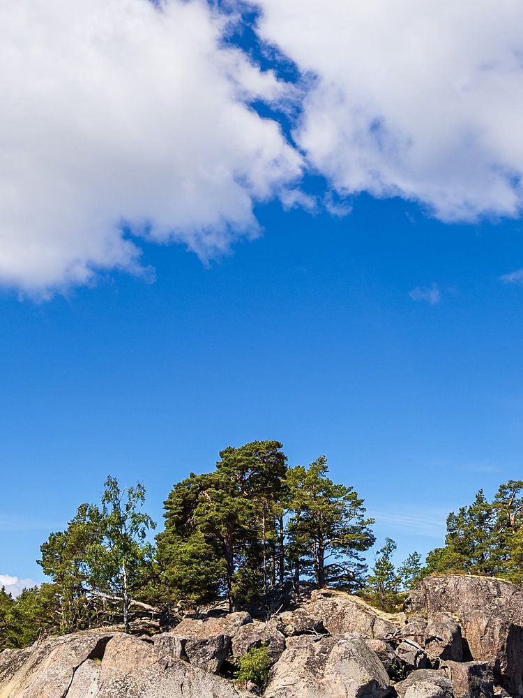 Ostseeküste mit Felsen und Bäumen im Schärengarten vor Västervik in Schweden.