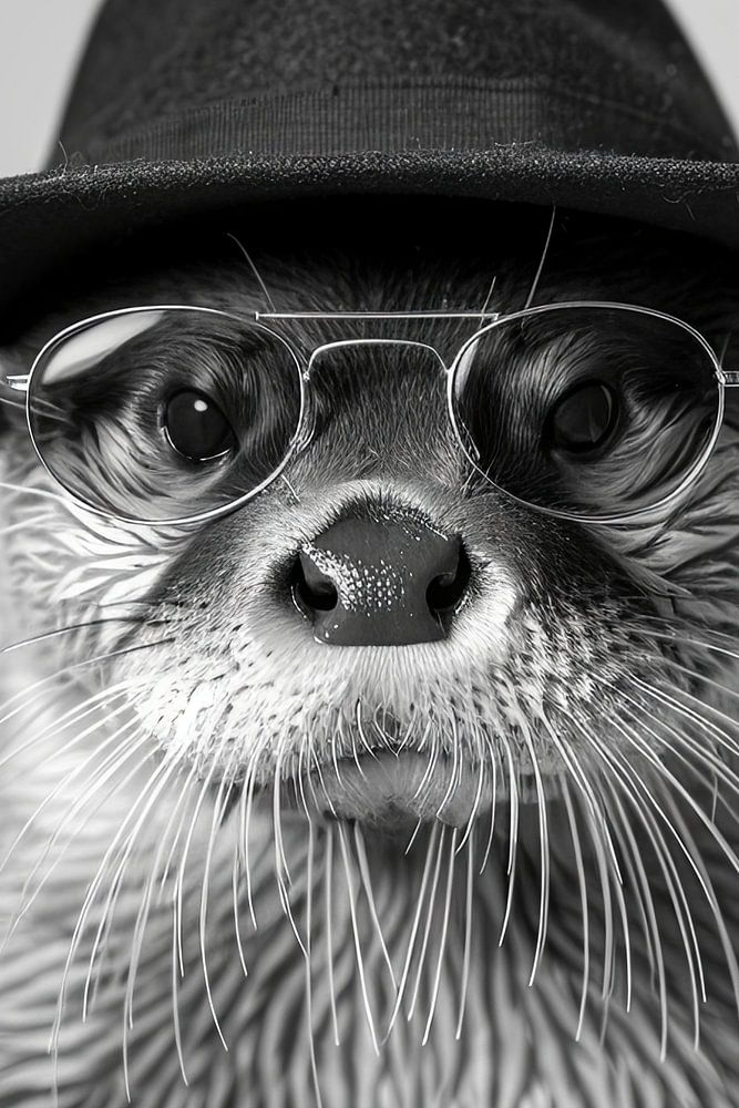 Ein stilvolles Schwarz-Weiß-Bild eines Otters mit Hut und Brille. Der Otter trägt auch eine Halskette, was ihm ein cooles Aussehen verleiht.