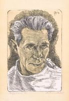 Porträt des Künstlers selbst, eine Lithographie in Weiß, Schwarz und Gelb. Der grauhaarige Mann schaut mit dem Kopf leicht nach vorne, was ein Stirnrunzeln auf seinem Gesicht erscheinen lässt.
