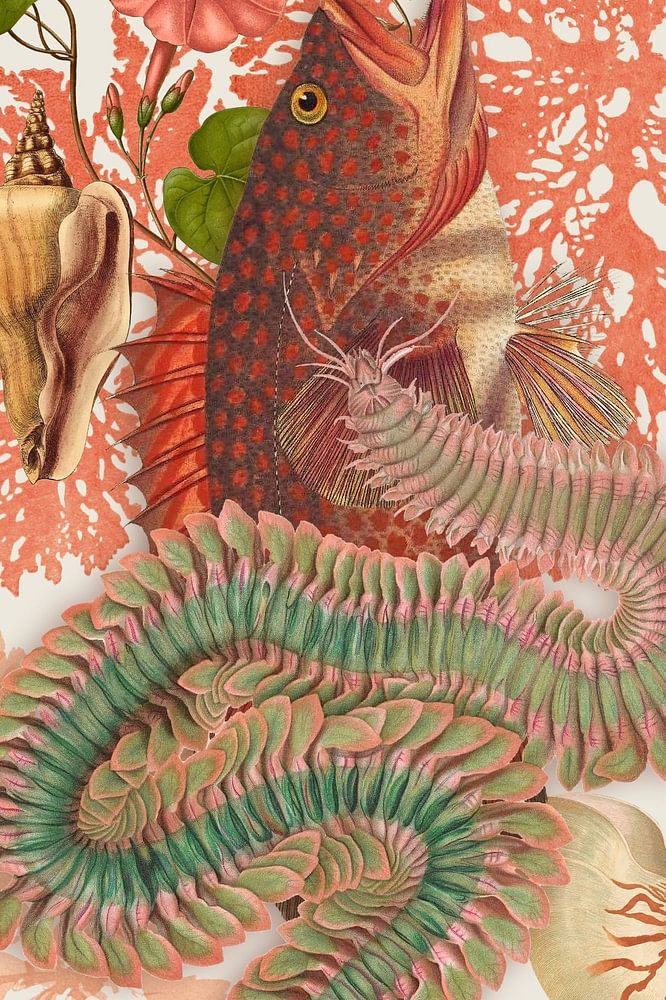 Elemente aus dem Meer sind die Inspiration für diese digitale Collage. Das Spiel mit verschiedenen Ebenen übereinander, eine Kombination in warmen Rosa- und Orangetönen.