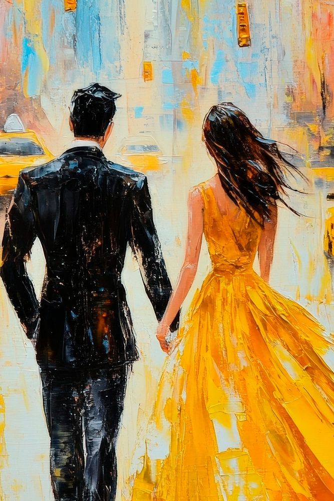 Ein zauberhaftes Spiel aus Farben fängt den Abend in einer pulsierenden Stadt ein, wo ein Paar Hand in Hand durch den Regen schreitet. Die strahlend gelbe Kleid und die leuchtenden Taxis schaffen eine warme, romantische Atmosphäre. Dieses Kunstwerk perfektioniert jede Wand im Wohnzimmer und bringt einen Hauch von urbaner Eleganz ins Zuhause.
