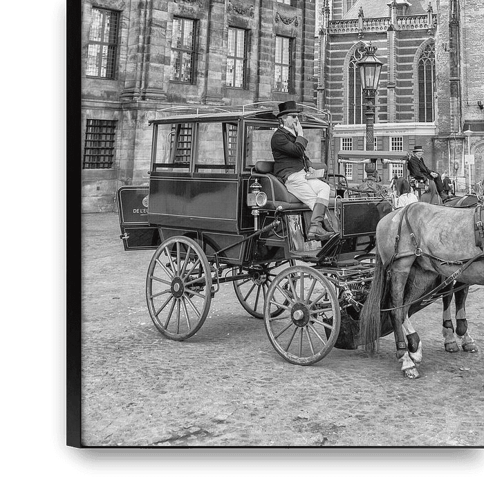 Bestelle dieses moderne Wandbild Paard en wagen op de Dam in Amsterdam. von Don Fonzarelli als Reproduktion auf Leinwand, Alu-Dibond, als Poster, Fototapete oder Acrylglasbild.