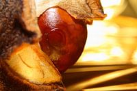 Paardenkastanje nog in de bolster belicht met van goudfolie gereflecteerd licht.