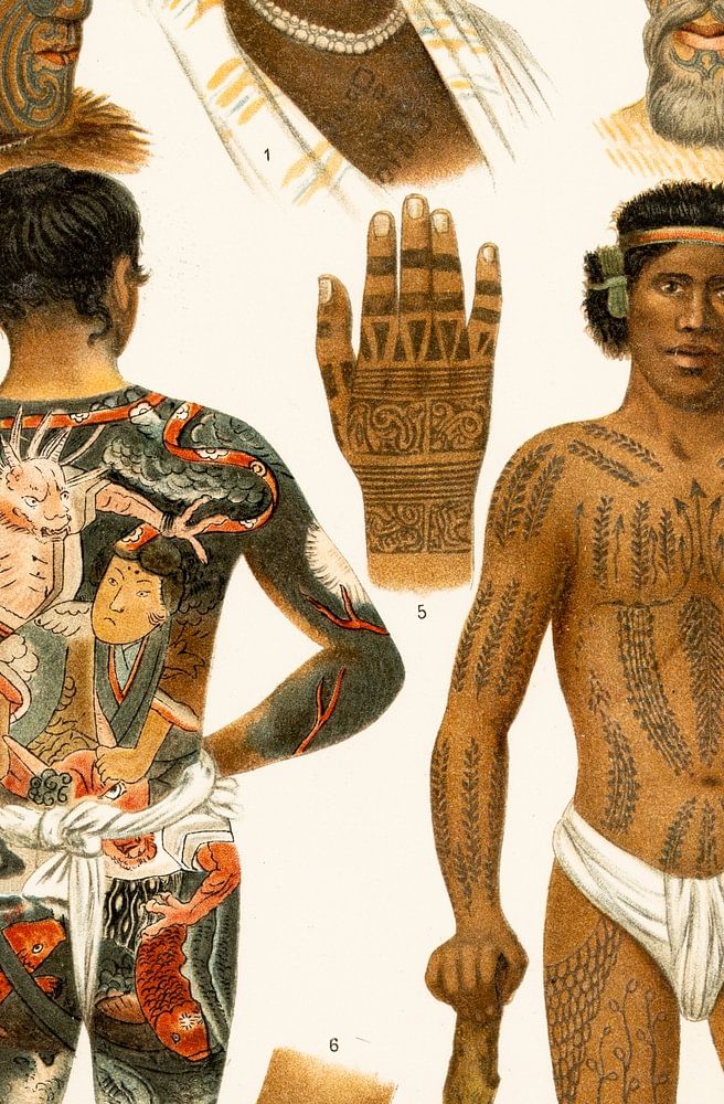 Dieser antike Farbdruck aus der Zeit um 1900 zeigt Beispiele von Stammestätowierungen. Wir sehen unter anderem Beispiele von Tätowierungen aus Japan, Maori aus Neuseeland und Dayak aus Borneo.