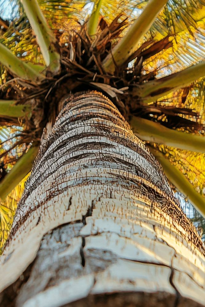 Hoch hinauf zur strahlenden Sonne, die durch die üppigen, grünen Blätter blitzt, erstreckt sich der majestätische Palmenstamm. Die raue Textur des Holzes erzählt Geschichten von Winden und Stürmen, während der Himmel in sanften, beruhigenden Blau- und Gelbtönen leuchtet. Ein Ort des Traums, wo die Zeit stillzustehen scheint und die Natur in voller Pracht erblüht.