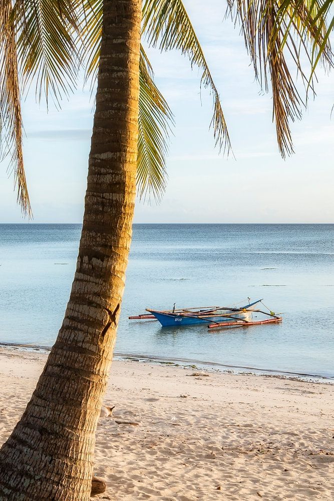 Palmen und Meer mit Bangka Boot zum Sonnenuntergang auf der Insel Siquijor auf Philippinen