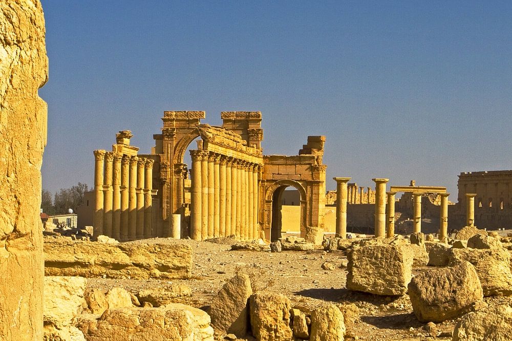 Dieses Bild zeigt die antike Oasenstadt Palmyra in Syrien – einst ein glanzvoller Knotenpunkt zwischen Ost und West, heute ein Mahnmal der Vergänglichkeit. Die Ruinen, vom goldenen Wüstenlicht durchflutet, stehen stellvertretend für eine Hochkultur, die Handel, Kunst und Architektur zu verbinden wusste wie kaum eine andere in der Region. Tempel, Torbögen, Kolonnaden – was über Jahrtausende Wind und Sonne standhielt, wurde in wenigen Jahren durch Krieg und Zerstörung massiv beschädigt.