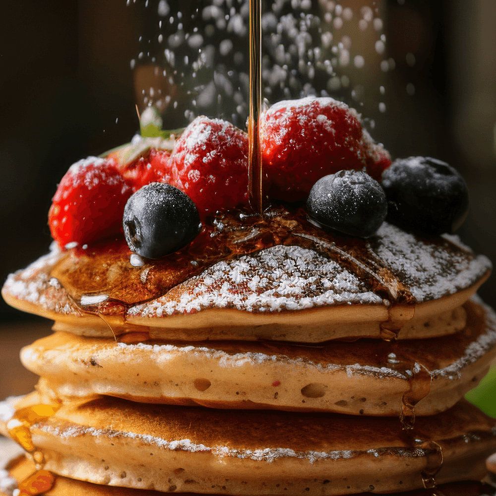 Dieses lebendige Bild zeigt perfekt zubereitete Pancakes, die mit einer großzügigen Portion frischer Beeren und einem Schuss Sirup verziert sind. Der detaillierte Puderzucker-Effekt und die realistischen Farben machen es zu einem herausragenden Dekorationsstück für Küchen und Esszimmer. Ein Muss für Genießer und Liebhaber von stilvollem Küchendekor.