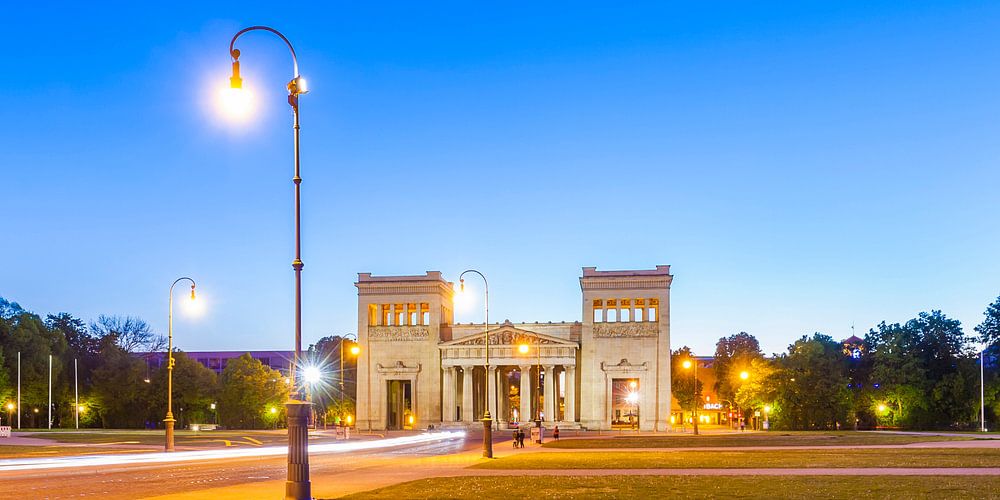 Der Königsplatz mit den Staatlichen Antikensammlungen, Propyläen und der Glyptothek in München bei Nacht, Bayern, Deutschland