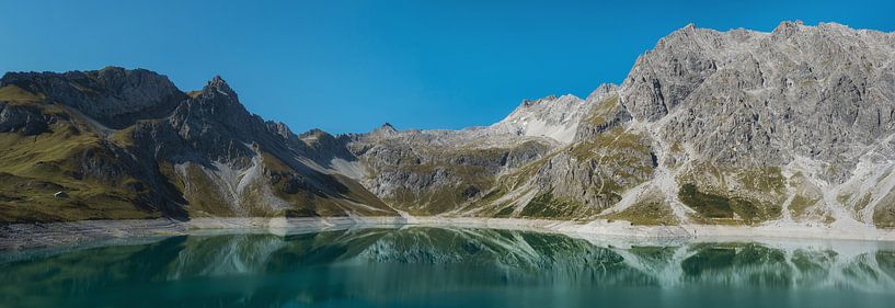 Panorama eines Lunersee stausees im Brandnertal, Montafon in Vorarlberg/Österreich. Die Bergketten spiegeln sich im Wasser.