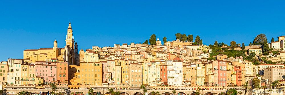 FOTOGRAFIE Panoramaaufnahme Malerische, bunte Wohnhäuser in der Altstadt von Menton an der Côte d'Azur in Frankreich