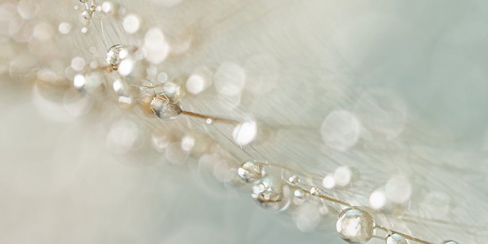 "Panorama pastellfarbene Abstraktion: Wassertropfen auf einem spinnwebigen Flaum" ist ein abstraktes Makrofoto von Wassertropfen, die an einem der flauschigen Haare eines Morgensterns (Tragopogon) hängen. Um ein schönes abstraktes Bild zu erhalten, habe ich die Einstellungen so gewählt, dass nur einige wenige Haartröpfchen scharf sind und dahinter (und davor) die Schärfe schnell in Unschärfe übergeht (Überblendung). So entsteht ein Bild, bei dem die Realität in eine Art abstrakte Traum- oder Fantasiewelt überzugehen scheint.