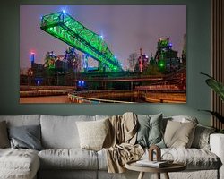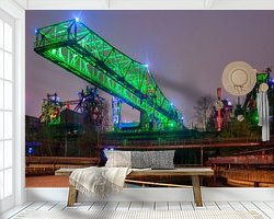 Abendaufnahme mit langer Verschlusszeit des ehemaligen ThyssenKrupp-Hochofenkomplexes, jetzt Landschaftspark Duisburg, mit verschiedenfarbiger LED-Beleuchtung, um die verschiedenen Industrieanlagen an den Wochenenden zu beleuchten. Dieses Foto wurde im März 2019 aufgenommen. Der große Erzkran mit dem Spitznamen "Krokodil". Landschaftspark Duisburg-Nord, gelegen im Ruhrgebiet (Ruhrpott) bei Duisburg. Nordrhein-Westfalen.